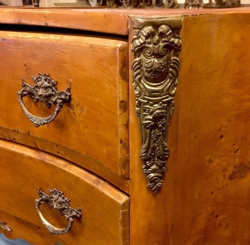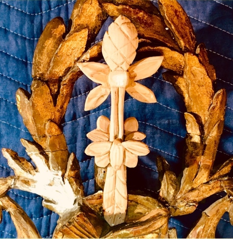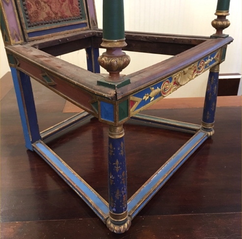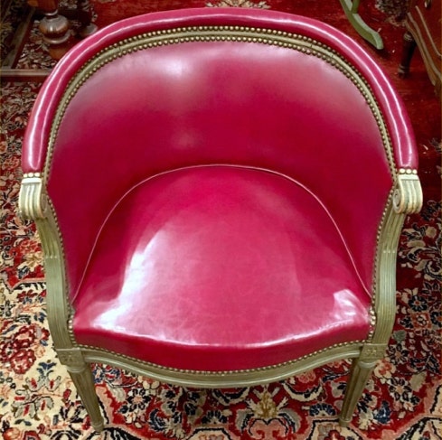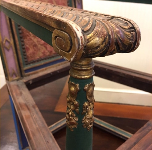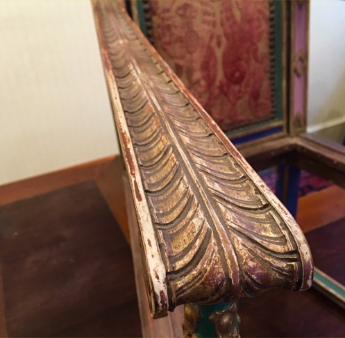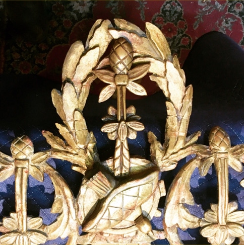 Loving these Louis 16th style, giltwood Bergère chairs. Hand-carved in the 19th century from European Beech, they’re clearly by the same maker, but definitely not the same chair. Unfortunately they had been “fixed” by an amateur before being upholstered, and the tension of the cloth snapped the crest rails right off. Looking pretty good now, though.