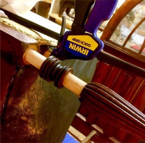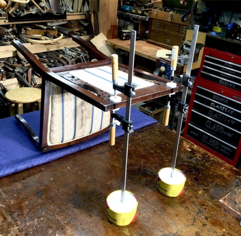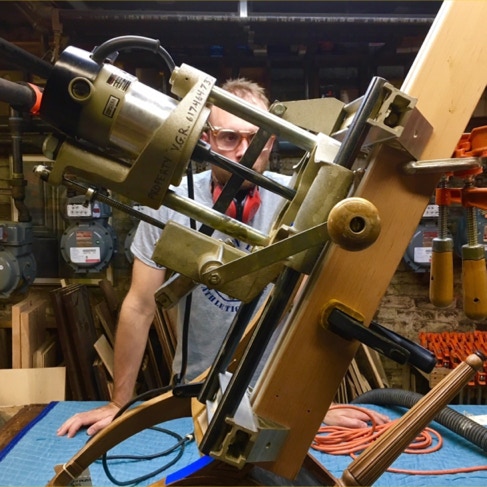 Sometimes it’s entirely counter-indicated to disassemble a piece of furniture during repair… so here Jordan uses a rotary rasp to shape-in-place a section of stretcher he fabricated for this handsome, handmade dining chair.