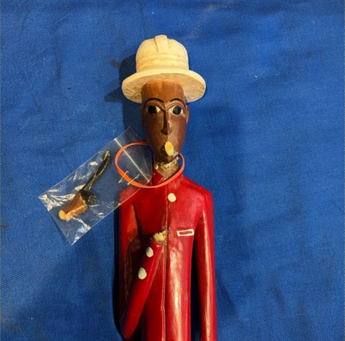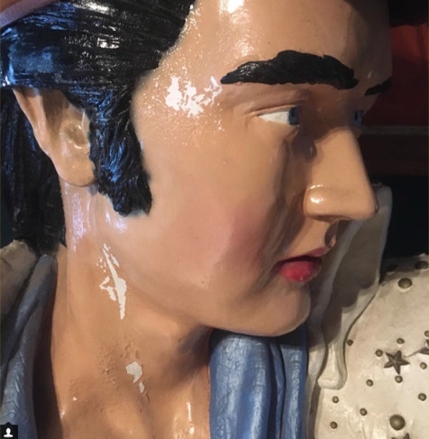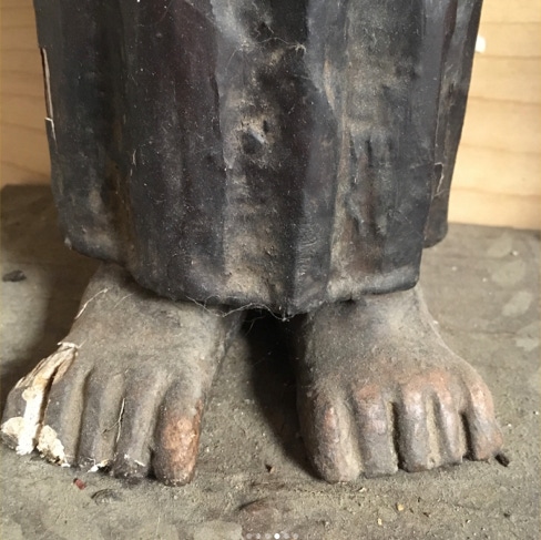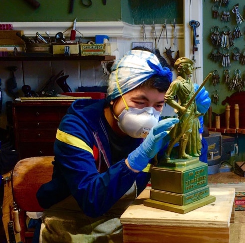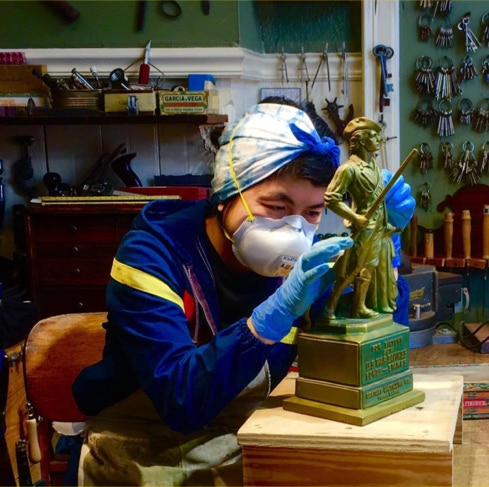 When this commemorative War Bonds statue came to us it was massively damaged. Koko expertly formed, carved and colored all the missing and crushed areas. Here she’s just doing a little touch-up.