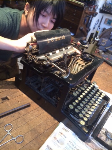 This great L.C. Smith Model 8 is in just the right hands. After spending decades on a basement floor collecting dust and rust, a full restoration is in order, and Koko is at the helm. Here she is installing eBay-found replacement linkages for the 100 and 1000 tabulator keys. This unit will be dis- and re-assembled several times over the course of the repair as she works to adjust tolerances and meticulously clean each part. Also in the shop right now is a tiny little Olympia that was used by our customer at her first job in a newsroom typing pool. Imagine the sound in there!