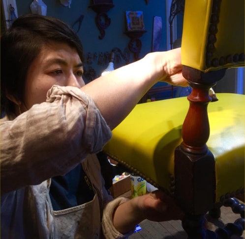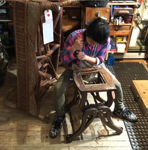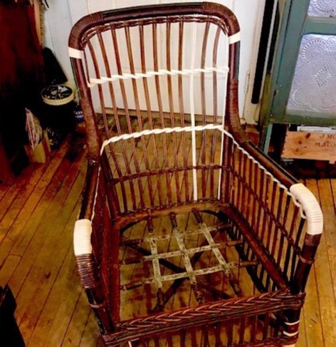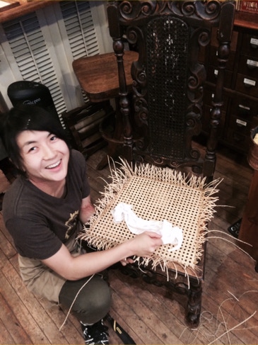 Koko getting ready to put the binding cane on this awesome Spanish revival chair, one of a set of six with various repair needs. In this case the customer will be coloring the seat herself.