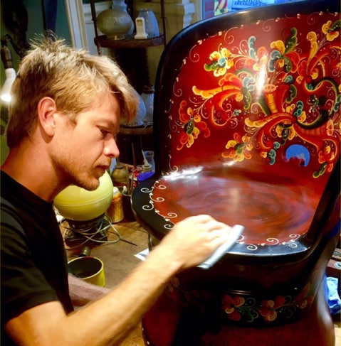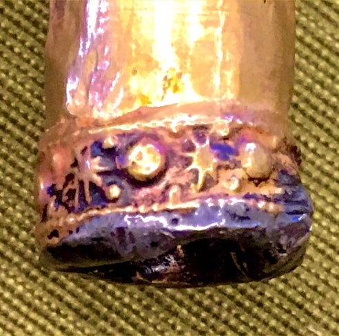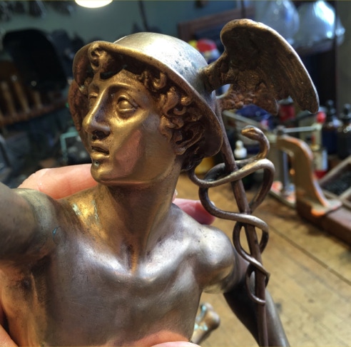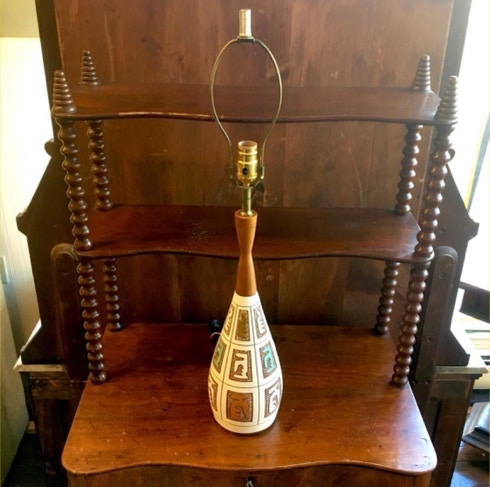 This vase-come-lamp is in the shop to have it’s lip repaired. Seth will be building the missing material from epoxy putty, and Koko will carefully color to match, then off to Jeremy to clear-coat the patch.