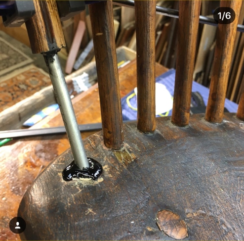 Here, the repaired section is nearly ready for color… but first, as scarf joints like this are vulnerable to shearing, Stephen will insert a thin steel rod through a hole in the leg to provide support.