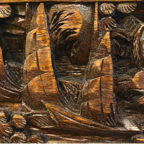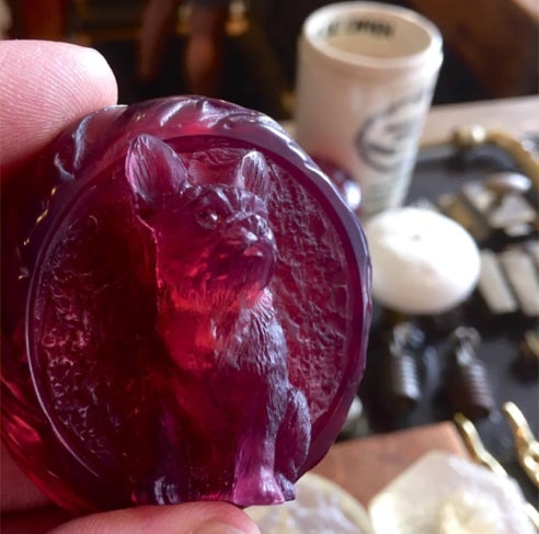 This is fun: A carving of a folded shirt with holes drilled where the stitching would be, so that light from led strips mounted inside can shine through. So silly! Not much to repair, they just needed a new dc adapter. Fun to have it here for a few minutes though. Zoom to see the texture!