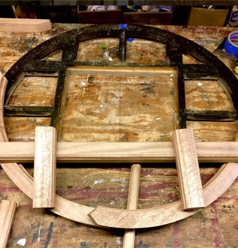 Here’s a wild one: Someone had stripped the finish off of the outer side only of their cabinet doors. This allowed the environmental influences, over time, to curl them until they were more than an inch out of flat. Steming them back wasn’t a guaranteed win, so with the customer’s blessing, we cut a dozen kerfs into the concave side of each door, held them flat, and glued in strips of maple in order to keep them from curling again. This one is ready for a trim and a little touch-up and then we’ll lacquer the rough side of each one before sending them home with a brand-new pinstriped secret on the inside :)