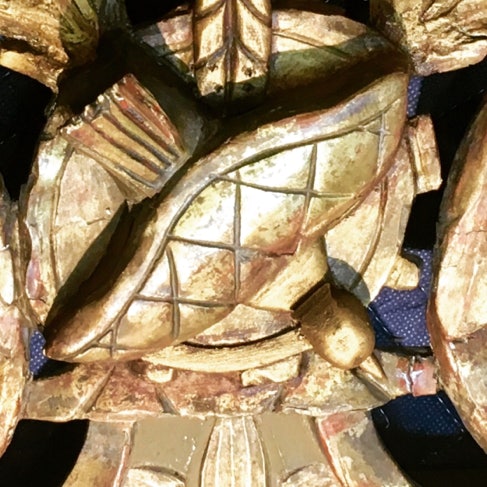 When this lovely gilt picture frame first came to us it was missing half a dozen chunks of molded plaster as a result of a packing error. Here, Lost Arts Chief, Koko Yanagita begins to carve leaves back in to the rails after adding fresh material. This kind of repair work is custom-made for the rocksteady hands of Koko, and gives her a chance to hone her water gilding skills as well! So cool.