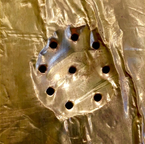 Here is the same repair, all glued up, with some epoxy fill in the blown-out areas. After Koko colors and patinas over our work, no one will be able to detect the repair unless they are specifically looking for it.