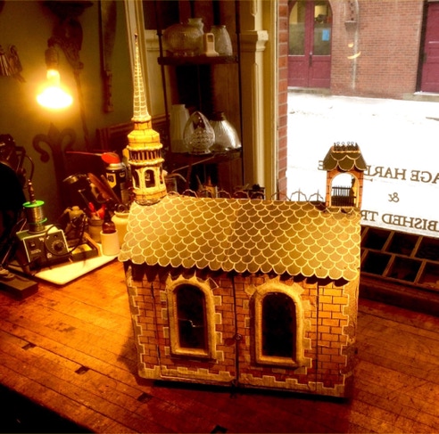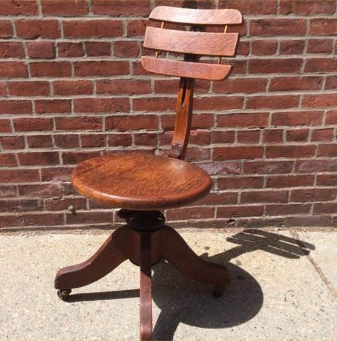 Seth getting ready to convert this charming old sewing machine table into a writing desk. The sewing machine itself will donated to an artist who is working with decaled and painted steel parts, but the treadle will remain as a place to rest one’s feet while writing. A new top has been chosen that was recovered from an old children’s bureau. Should be fun!