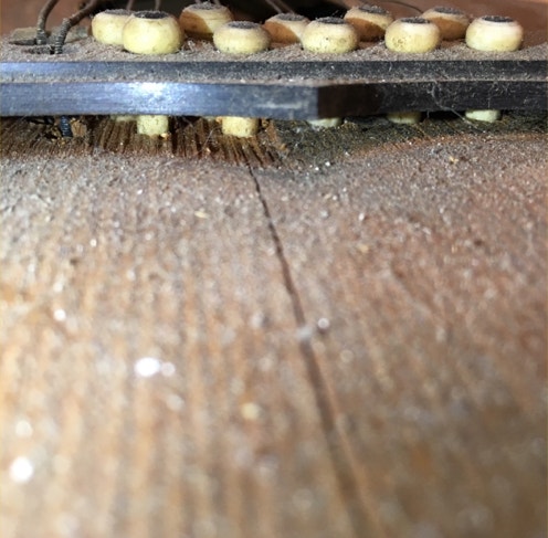 This nesting table had such a terrible warp to the top, that we had to cut twenty saw kerfs in the underside