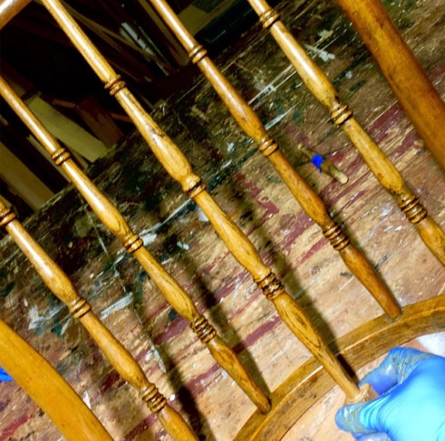 Checking the color match on a replacement spindle we turned for this sweet little bow-back rocker.