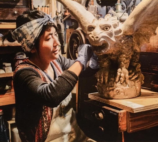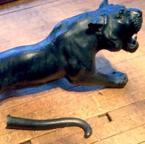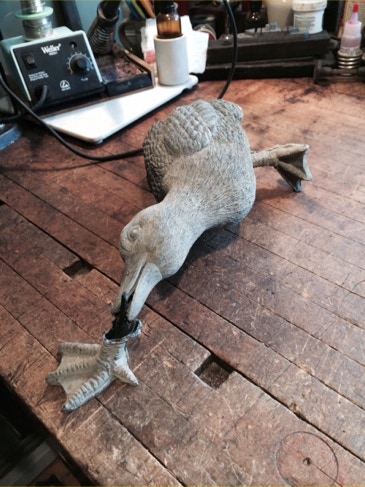 This concrete griffin arrived at our shop having taken quite the tumble. It’s not a ‘valuable’ item but it is super-important to its owner, so we really gave it our all. After carefully bending the steel structure back into shape, we replaced the crumbled areas with fresh concrete, pre-stained to match the old… Here Koko does some final touch-ups before sending it home to its mom. We’ve seen so many awesome things come across our benches, but there’s always a surprise… this is our very first concrete griffin!