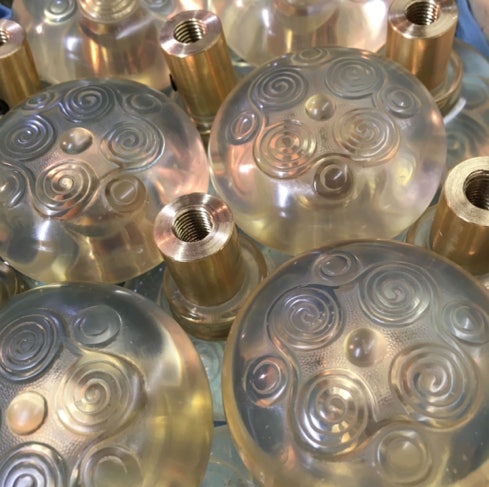 Here’s an awesome evolution: A customer of ours adored a beautiful brass Tiffany’s doorknob we had in the shop, but we only had one, so… We made a silicone mold of the original, and duplicated an entire house’s worth in clear plastic poured around glass shanks we turned for the job.