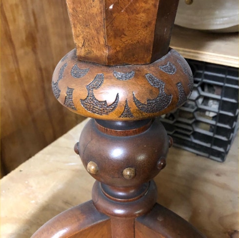 This fantastic Victorian sewing table was donated to our shop by @davidlazowski. The inlay is in really rough shape, but walnut body is perfect. These were being mass produced at the beginning of the industrial revolution using older designs that were modified for production. Some of them even have game boards on the top. We’re not really sure what we’ll do with it, but one idea is to use it for training. Sure is pretty. Thanks Laz! :)