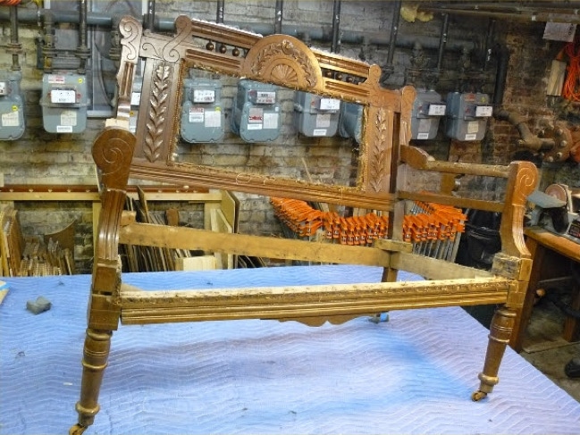 This Eastlake love seat has some serious problems. It arrived with a large lot of Victorian treasures that had been discovered by our customer in the basement of a recently inherited house. Every piece has serious damage, but utilizing our large stock of recovered wood, Jeremy should be able to find a perfect match for every break and have the whole lot ready for upholstery before the new year.
