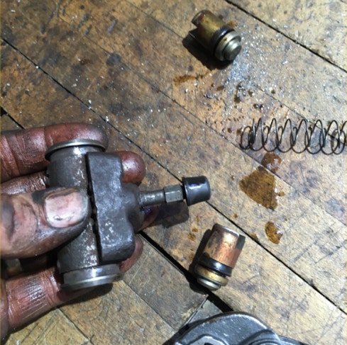 Rasperry, a ’76 BMW 2002 - one of RARE Restoration’s project cars - hadn’t been driven in quite a while, and as a result, the rear brake pistons were totally stuck. Here, the first side has been forced apart, and is ready to be cleaned in solvent with super-fine steel wool.