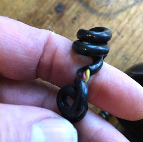 This far-out folding Adirondack chair came in having already been repaired once with some very soft aluminum wire, (that didn’t last). Here @sethdeasy inserts some larger gauge brass rod after having up-sized the holes to accept it. It’s weirdly comfortable considering it made entirety of slats. I kinda want one