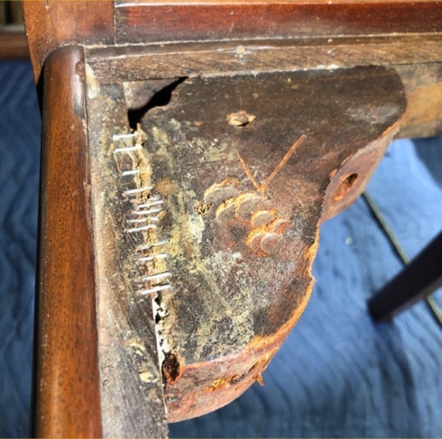It would seem that in an attempt to stabilize the chair, a well meaning upholsterer tried to use rows of staples to hold the corner blocks in. It’s not the first time I’ve seen this, but it never fails to make me laugh.