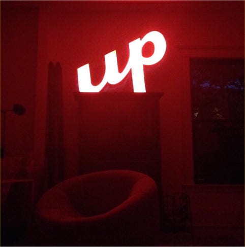 A former employee of ours got her hands on the old illuminated sign from the now-defunct Beacon Supermarket and gave away all but the u & p. Since all of the plexiglass had been smashed by the time she brought it to us for a makeover.