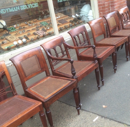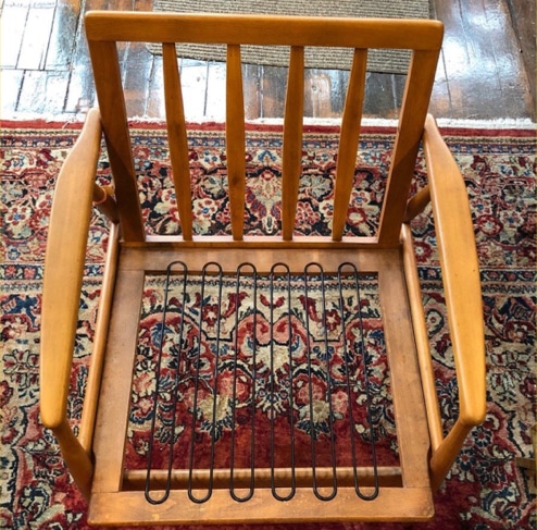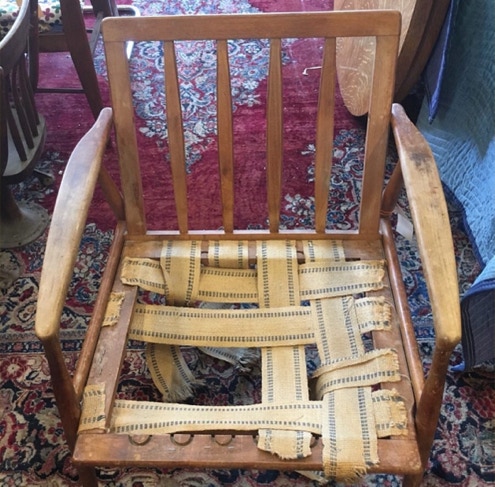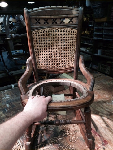 Koko getting ready to put the binding cane on this awesome Spanish revival chair, one of a set of six with various repair needs. In this case the customer will be coloring the seat herself.