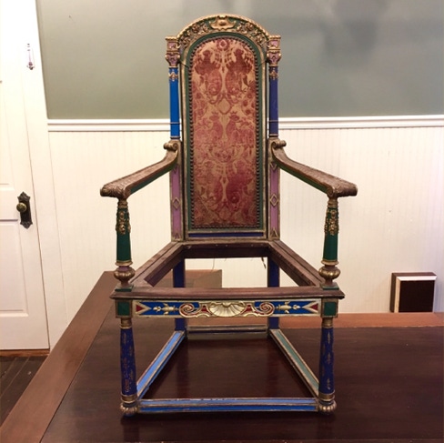 This Eastlake love seat has some serious problems. It arrived with a large lot of Victorian treasures that had been discovered by our customer in the basement of a recently inherited house. Every piece has serious damage, but utilizing our large stock of recovered wood, Jeremy should be able to find a perfect match for every break and have the whole lot ready for upholstery before the new year.