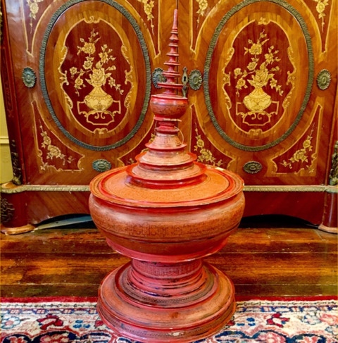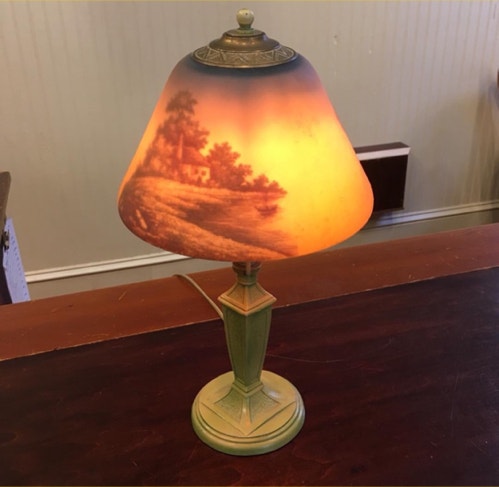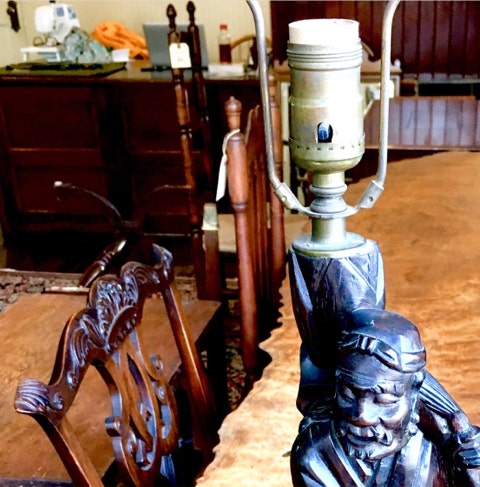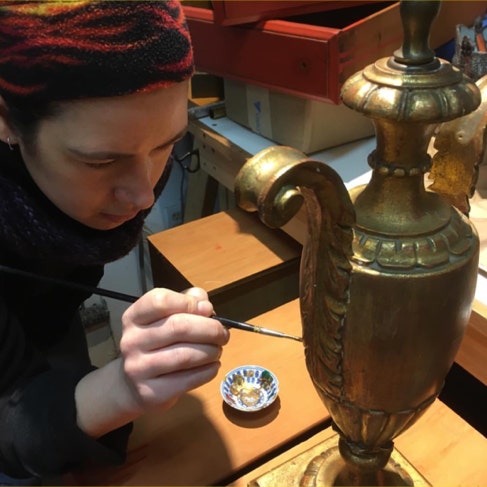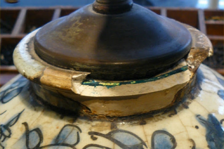 This vase-come-lamp is in the shop to have it’s lip repaired. Seth will be building the missing material from epoxy putty, and Koko will carefully color to match, then off to Jeremy to clear-coat the patch.