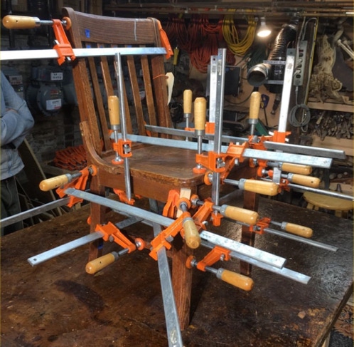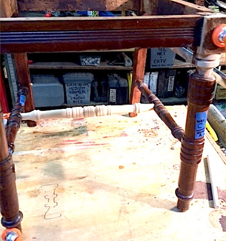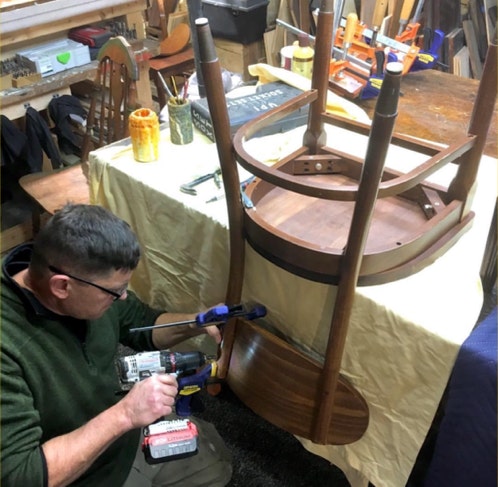 Sometimes it’s entirely counter-indicated to disassemble a piece of furniture during repair… so here Jordan uses a rotary rasp to shape-in-place a section of stretcher he fabricated for this handsome, handmade dining chair.