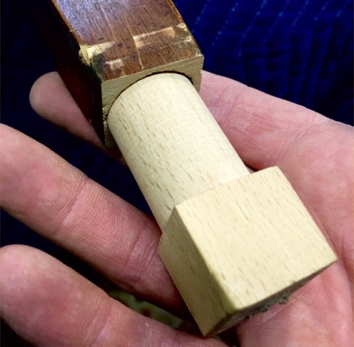 Now this large maple dutchman can be passed into the mortise with wood glue, making what is frequently thought of as a catastrophic injury, no big deal at all.