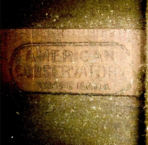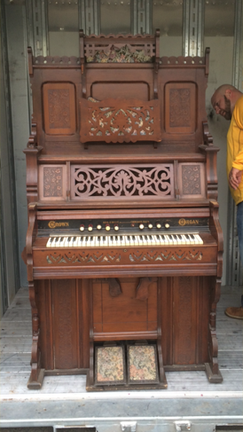 This super-cool Eastlake style pump organ just arrived at our shop in a moving pod from New Mexico. We haven't gotten a chance to do a deep-level evaluation of its issues yet, but so far the only obvious problems are a jammed stop, some loose bits of wood and crackling in the finish. Here's the great thing though, the customer included a sealed 8-track cassette of his mom's gospel hits as a gift to us! Good thing we've got an 8-track player on hand… Doesn't everybody?