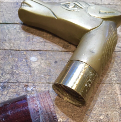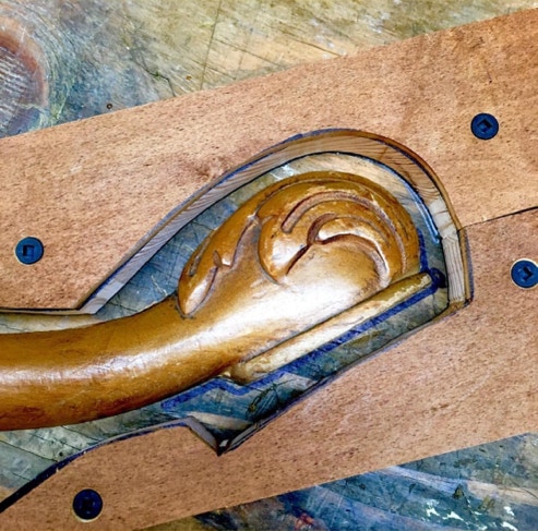 Here, the repaired section is nearly ready for color… but first, as scarf joints like this are vulnerable to shearing, Stephen will insert a thin steel rod through a hole in the leg to provide support.