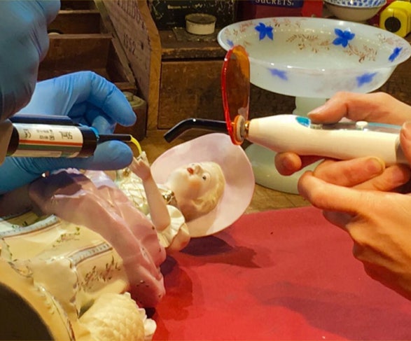 Here’s a cool one: Some of the fingers of this porcelain statuette were broken off, so we recreated them using Pulpdent, the same stuff dentists use for fillings. There are a ton of variations and lots of different shades of this product, all that cure in seconds with ultraviolet light. You can slow the curing time a little bit by holding the curing light, (above on the right), at a slight distance. But super-thin bits like these fingers needed to be cured right away or they droop, so the applicator tip has to be shielded to keep the material from curing in the opening. This stuff is a great addition to any woodshed, and you can learn all about it at: www.pilpdent.com