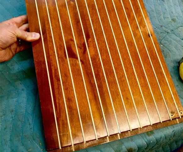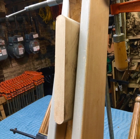 Here’s a wild one: Someone had stripped the finish off of the outer side only of their cabinet doors. This allowed the environmental influences, over time, to curl them until they were more than an inch out of flat. Steming them back wasn’t a guaranteed win, so with the customer’s blessing, we cut a dozen kerfs into the concave side of each door, held them flat, and glued in strips of maple in order to keep them from curling again. This one is ready for a trim and a little touch-up and then we’ll lacquer the rough side of each one before sending them home with a brand-new pinstriped secret on the inside :)