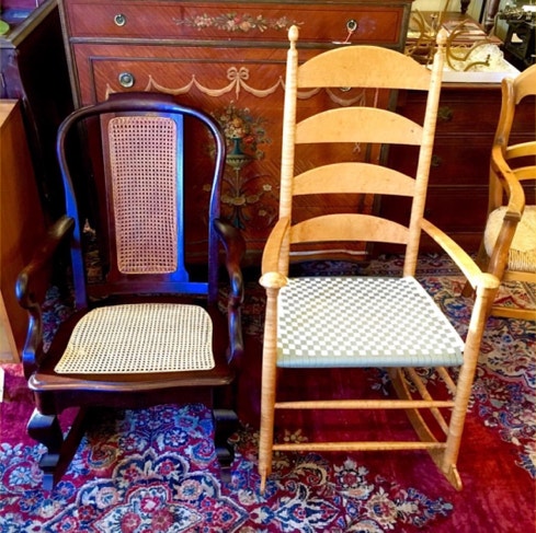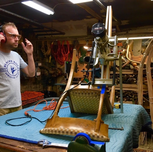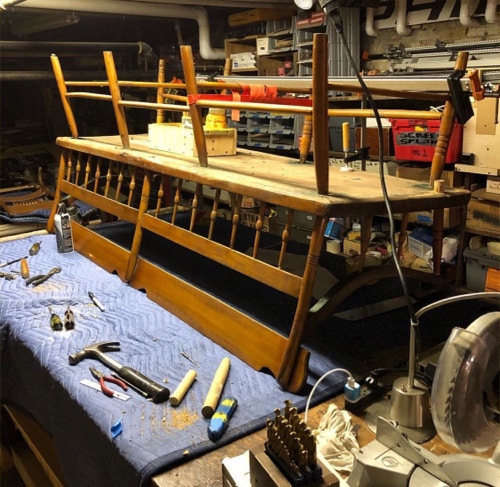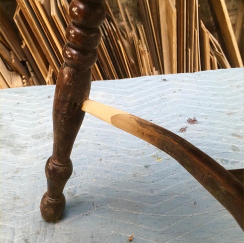 Checking the color match on a replacement spindle we turned for this sweet little bow-back rocker.