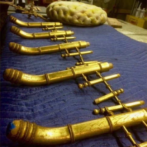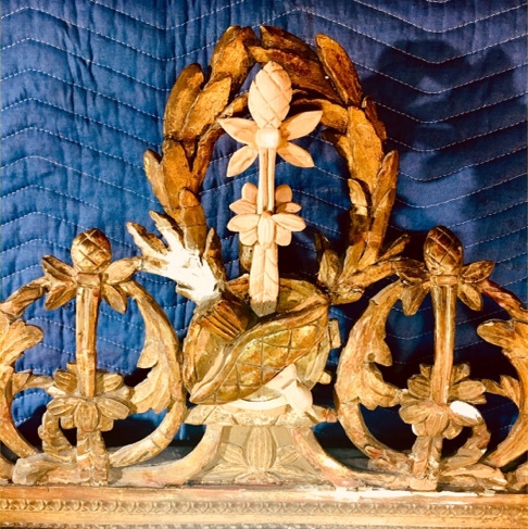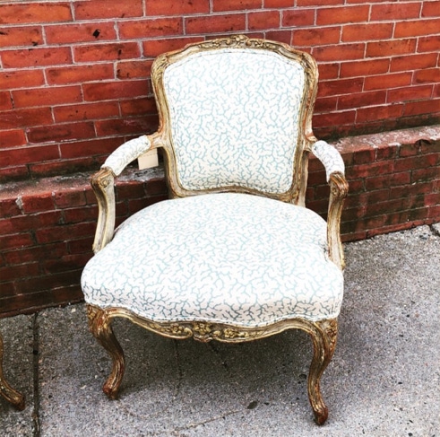 Loving these Louis 16th style, giltwood Bergère chairs. Hand-carved in the 19th century from European Beech, they’re clearly by the same maker, but definitely not the same chair. Unfortunately they had been “fixed” by an amateur before being upholstered, and the tension of the cloth snapped the crest rails right off. Looking pretty good now, though.