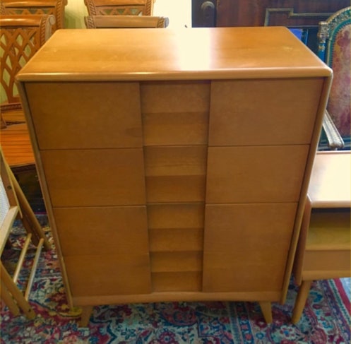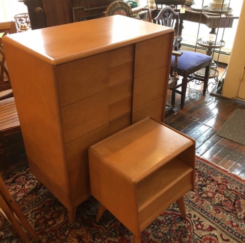 In our shop for refinishing, this Heywood Wakefield dresser and nightstand.