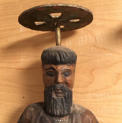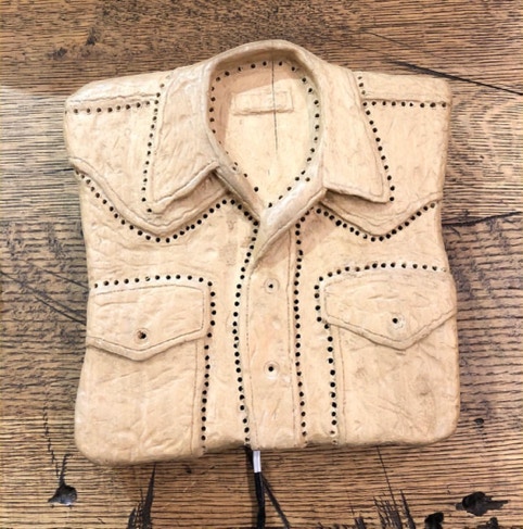 This is fun: A carving of a folded shirt with holes drilled where the stitching would be, so that light from led strips mounted inside can shine through. So silly! Not much to repair, they just needed a new dc adapter. Fun to have it here for a few minutes though. Zoom to see the texture!