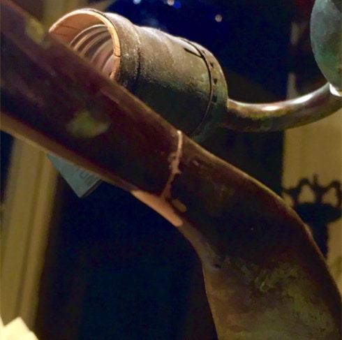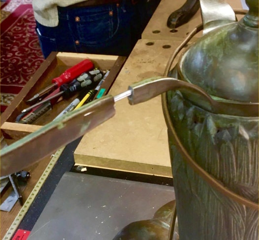 Gluing breaks, end to end, on long, thin elements never works. So when this Tiffany-style lamp came to us with the shade arm broken, we drilled a hole into both sides of the break and inserted a one-inch long stainless steel rod to support the weight. Properly glued, this will be a permanent repair. Pictured here is the dry-fit test which will show how we did with alignment and whether the rod moves freely enough to accept some minimally expanding CA glue.
