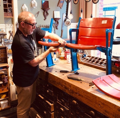 Here’s Seth finishing up these awesome Fenway seats our customer won at auction.