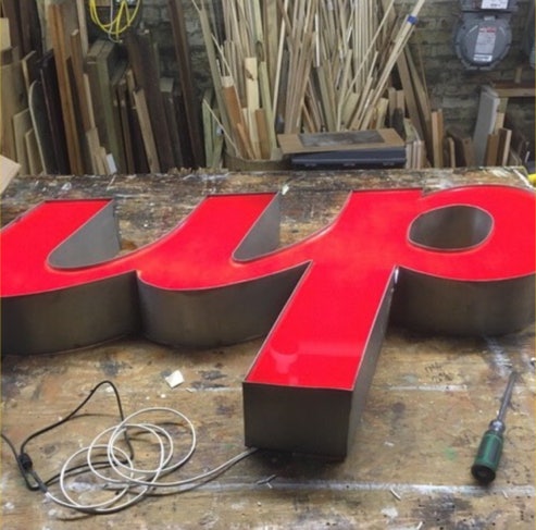 A former employee of ours got her hands on the old illuminated sign from the now-defunct Beacon Supermarket and gave away all but the u & p. Since all of the plexiglass had been smashed by the time she brought it to us for a makeover.