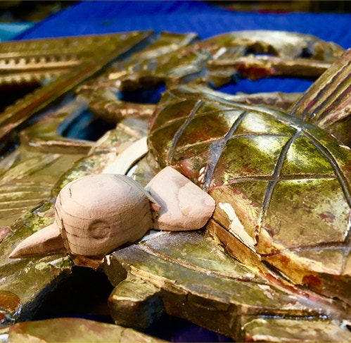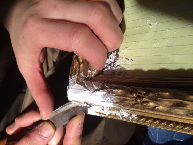 When this lovely gilt picture frame first came to us it was missing half a dozen chunks of molded plaster as a result of a packing error. Here, Lost Arts Chief, Koko Yanagita begins to carve leaves back in to the rails after adding fresh material. This kind of repair work is custom-made for the rocksteady hands of Koko, and gives her a chance to hone her water gilding skills as well! So cool.
