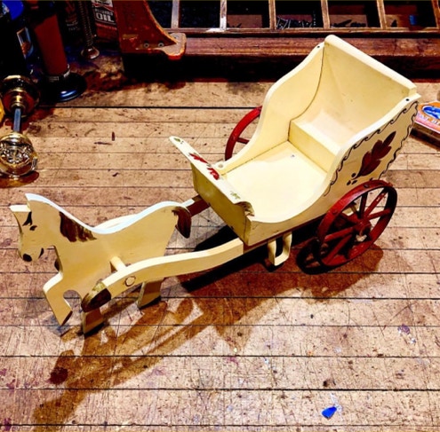 This cute little horse and coach, represent an important memory for our customer. He’s asked us to clean and repair them, but only to the state remembers them in. Here, we’re just about finished, and yes... the wheel’s gonna stay all wonky. What a cute little thing! I wish he still had the coachman.