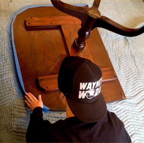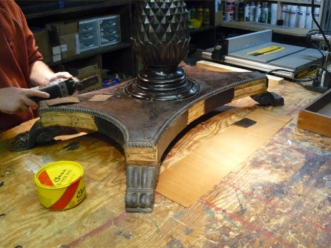 Jeremy stripping the remaining veneer off of this table base before replacing it completely. This is rewarding work - simple tricks that bring a piece from the basement to the living room on a short budget.