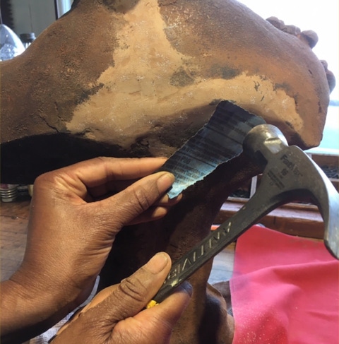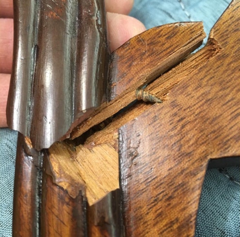 Here is the same repair, all glued up, with some epoxy fill in the blown-out areas. After Koko colors and patinas over our work, no one will be able to detect the repair unless they are specifically looking for it.