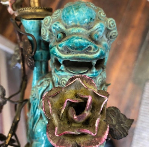 Once this little guy gets all cleaned up and some of the roses rebuilt, we’ll fix the shade and give it a rewire but, until then, it’ll stoically guard our desk.