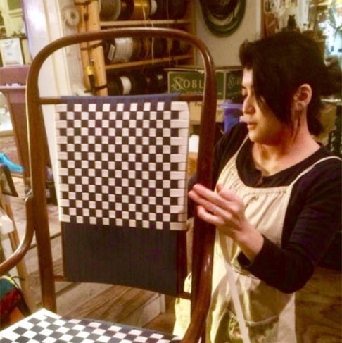 Here’s Koko weaving the last section of shaker tape on this sweet bentwood rocker. We love how freaked out your eyes get when you stare at the pattern for too long.